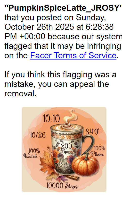 I was so upset when my own ai made design was removed! The title was “pumpkin spice latte” and it was a cup of coffee for pete’s sak-. nothing else- oh wait a cinnamon stick and a pumpkin. I made it myself. I have appealed, so hopefully they will let me know what is wrong with this. I even just searched for that title and found nothing like mine. Mine are free!!! Several people got a chance to download it before it was taken off. I got wonderful comments about it. What gives??
