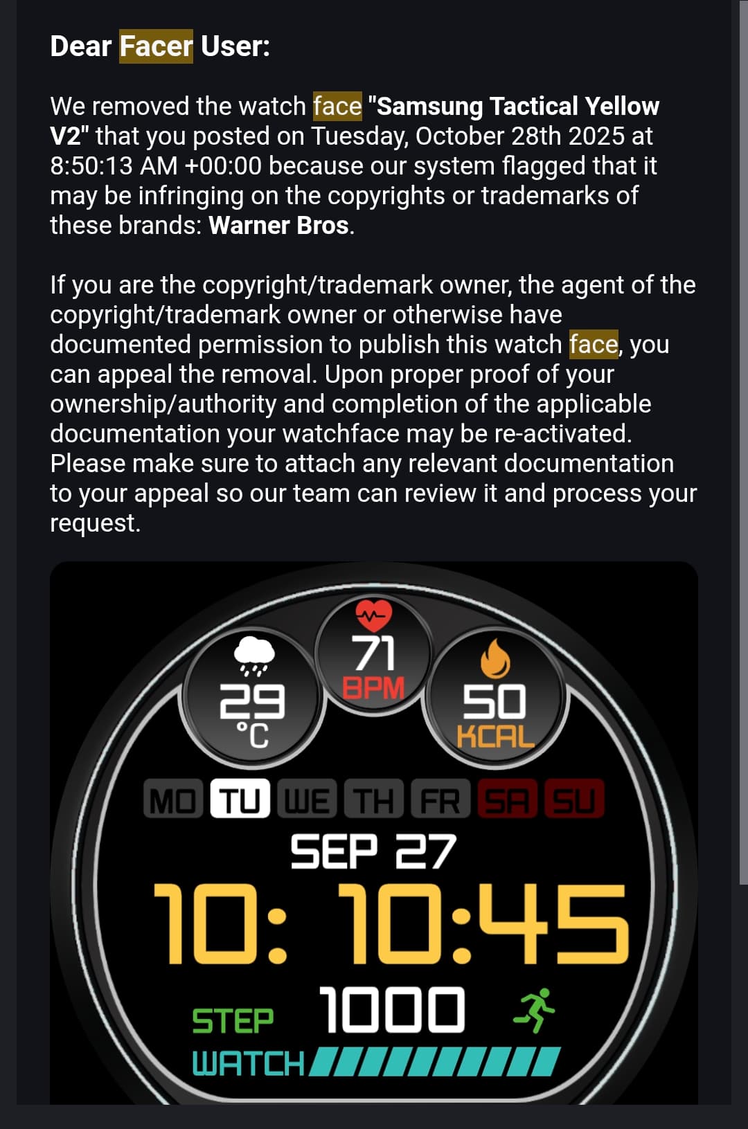 After review, our team has re-instated this face in your drafts. Please make sure you remove any possible infringement to trademarks or copyrights before republishing. This may include brand names in the watch face design itself, but also in the title, description, or tags.