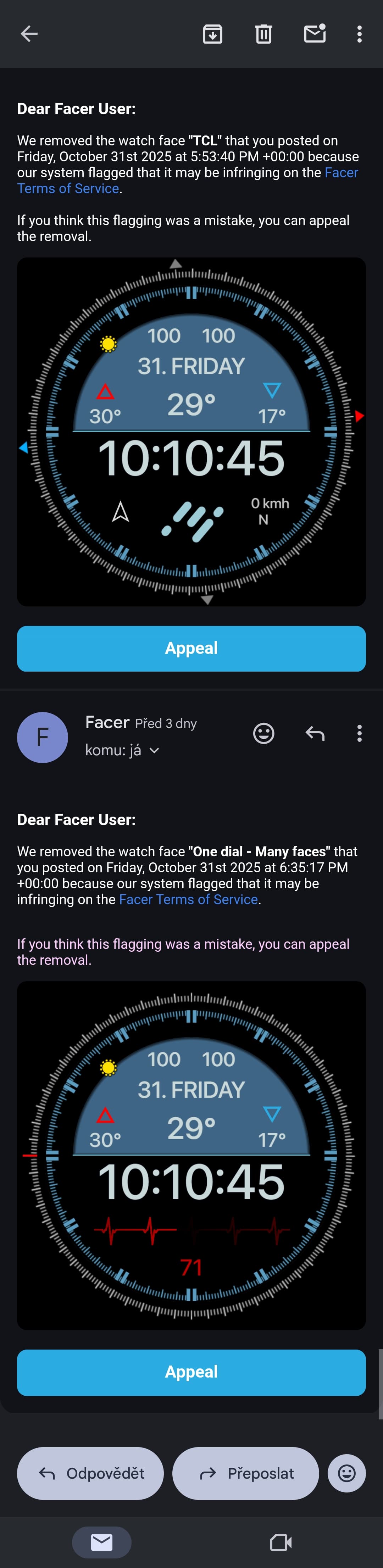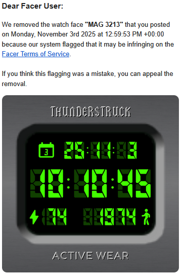 Well, I think this fits in here. I got the same face struck twice this morning. I figured it might be the words in the face. I reposted one with no words at all. It was immediately removed. But sadly, I posted a blue version of the same face two days ago and it was fine. @Facer_Official you need to get your act together. It’s no wonder people are migrating over to TIMEFLIK.